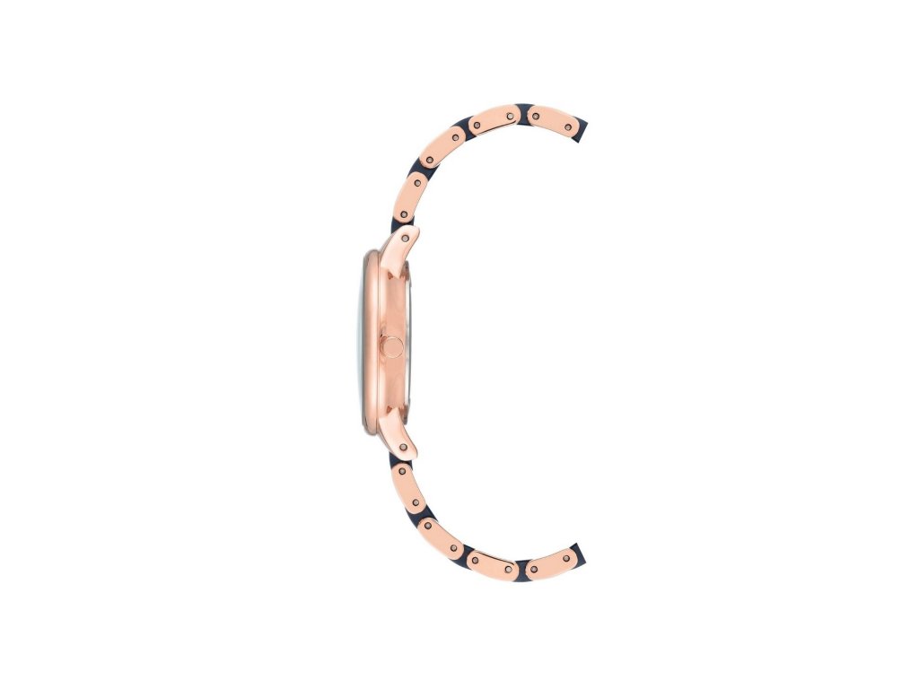 Sofistikované hodinky v tmavomodrej farbe s kovovými detailmi v ružovom zlate. Značka Anne Klein, pomenovaná po slávnej americkej vizionárke, prináša všetkým ženám možnosť vyjadriť sa niečím tak praktickým, ako sú hodinky. Perleťový ciferník a tyčinkové indexy zdobia trblietavé kryštály. Čierny keramický remienok dopĺňajú kovové okraje z ružového zlata. Hodinky chráni minerálne sklíčko a pozlátené puzdro s priemerom 32 mm. O jednoduché zapínanie sa stará klenotnícka spona.
