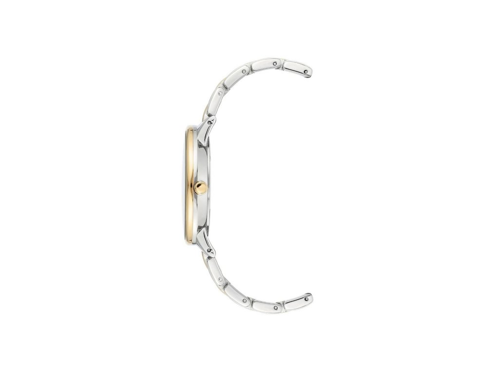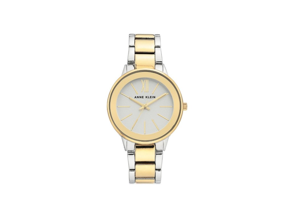 Sofistikované hodinky s kovovým remienkom. Značka Anne Klein, pomenovaná po slávnej americkej vizionárke, prináša všetkým ženám možnosť vyjadriť sa niečím tak praktickým, ako sú hodinky. Svetlý ciferník dopĺňajú zlaté indexy v podobe čiarok a rímskych číslic. Celok dopĺňa kovový remienok v zlatej farbe so strieborným lemom. Hodinky chráni minerálne sklíčko a puzdro s priemerom 37 mm. Jednoduché zapínanie zabezpečuje klenotnícka spona.