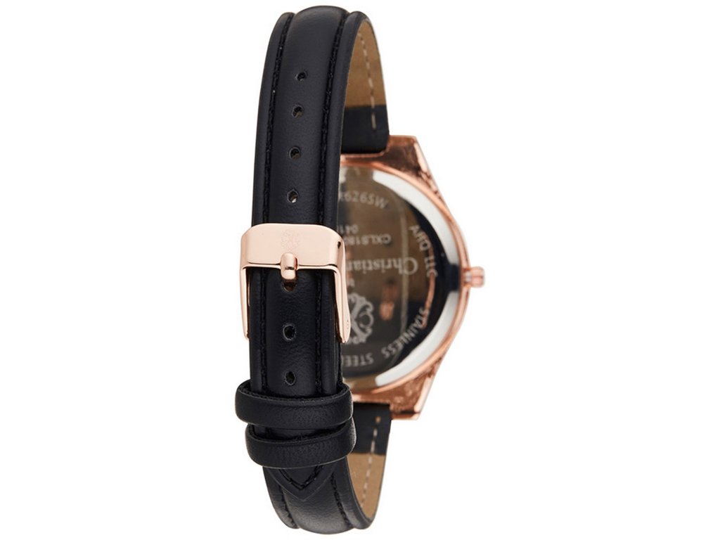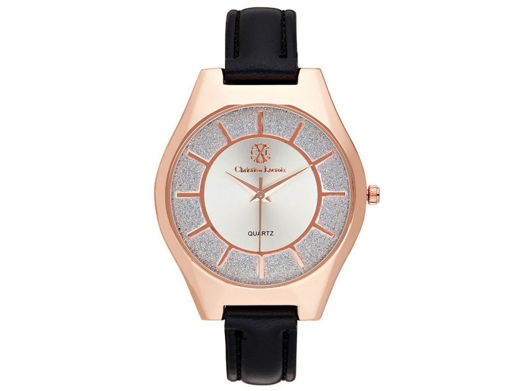 Dámske hodinky s ružovým pozlátením a čiernym koženým remienkom, zdobené sklenenými kamienkami v ciferníku.