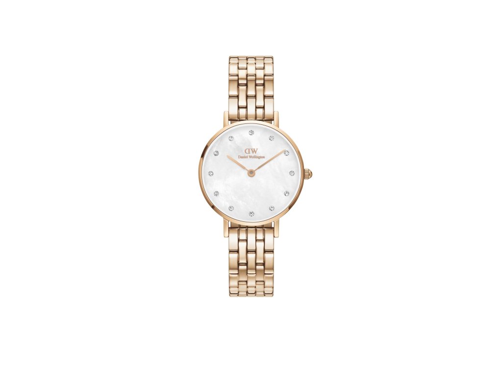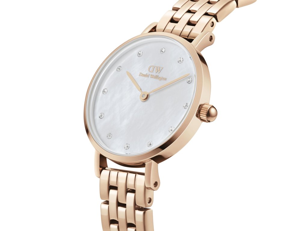 Dámske/dievčenské elegantné hodinky s jemnými detailmi a mladistvým nádychom, kde kryštály v ciferníku zdôrazňujú vzťah k móde a dizajnu všeobecne, celozlaté pokovovanie ružovým zlatom uspokojí ženy alebo dievčatá so vzťahom k tomuto drahému kovu, perla dodáva nádych iskrivej elegancie, okrúhle puzdro znamená nadčasovosť.