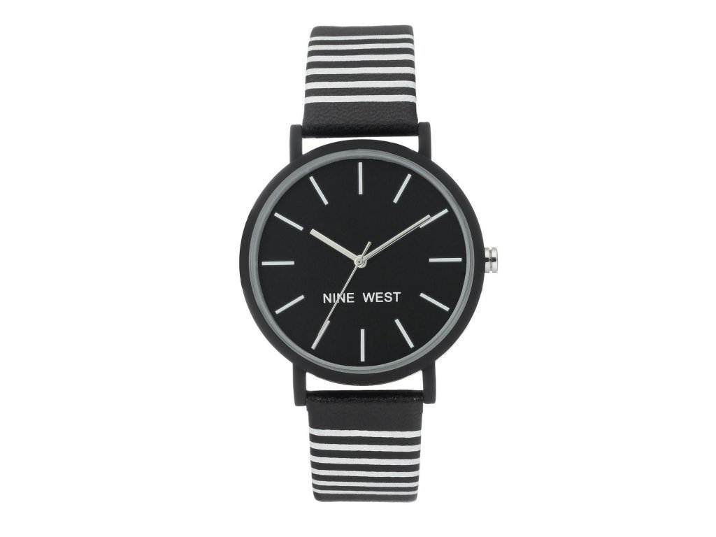 Dámske hodinky s čiernym remienkom a pruhovanou aplikáciou.