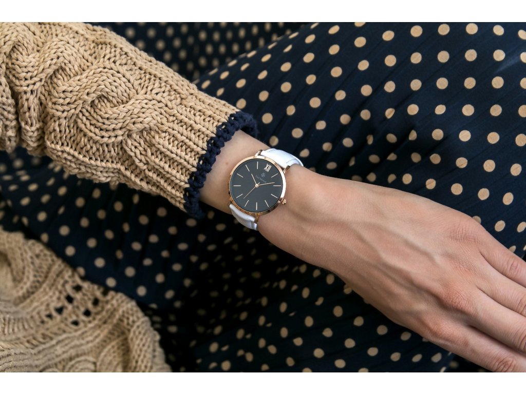 Dámske elegantné hodinky s bielym remienkom a kombináciou indexov s rímskymi číslicami.