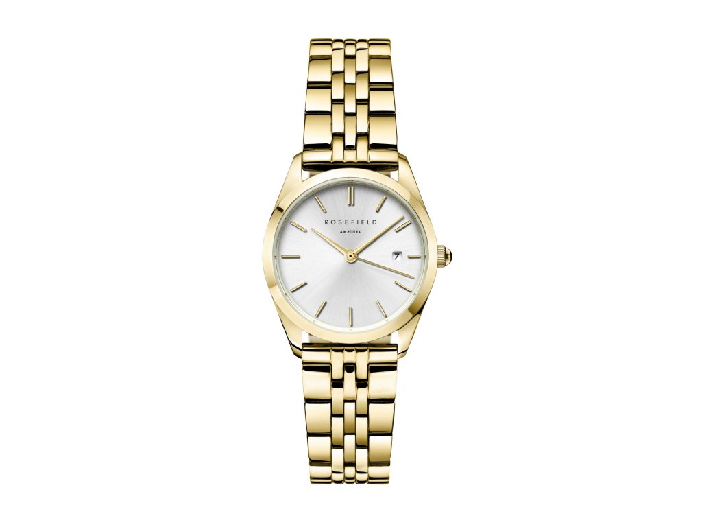 Elegantné hodinky malých rozmerov v striebornej a zlatej farbe so strieborným ciferníkom a dátumovkou