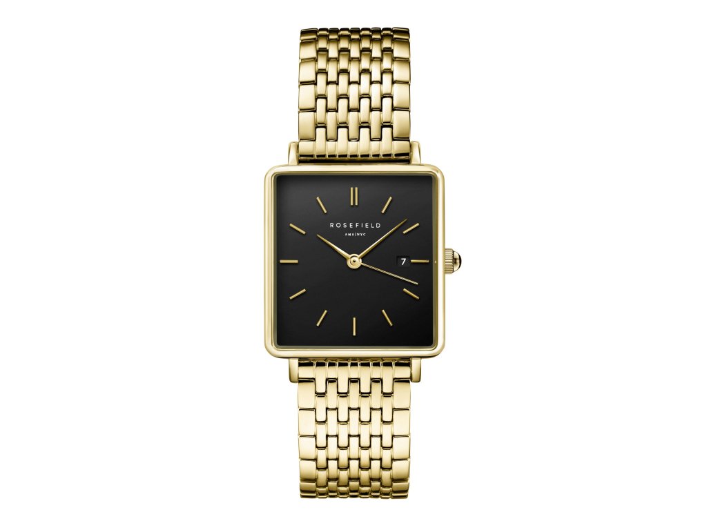 Štvorcové hodinky v zlatej farbe s čiernym ciferníkom, doplnené prepleteným oceľovým remienkom