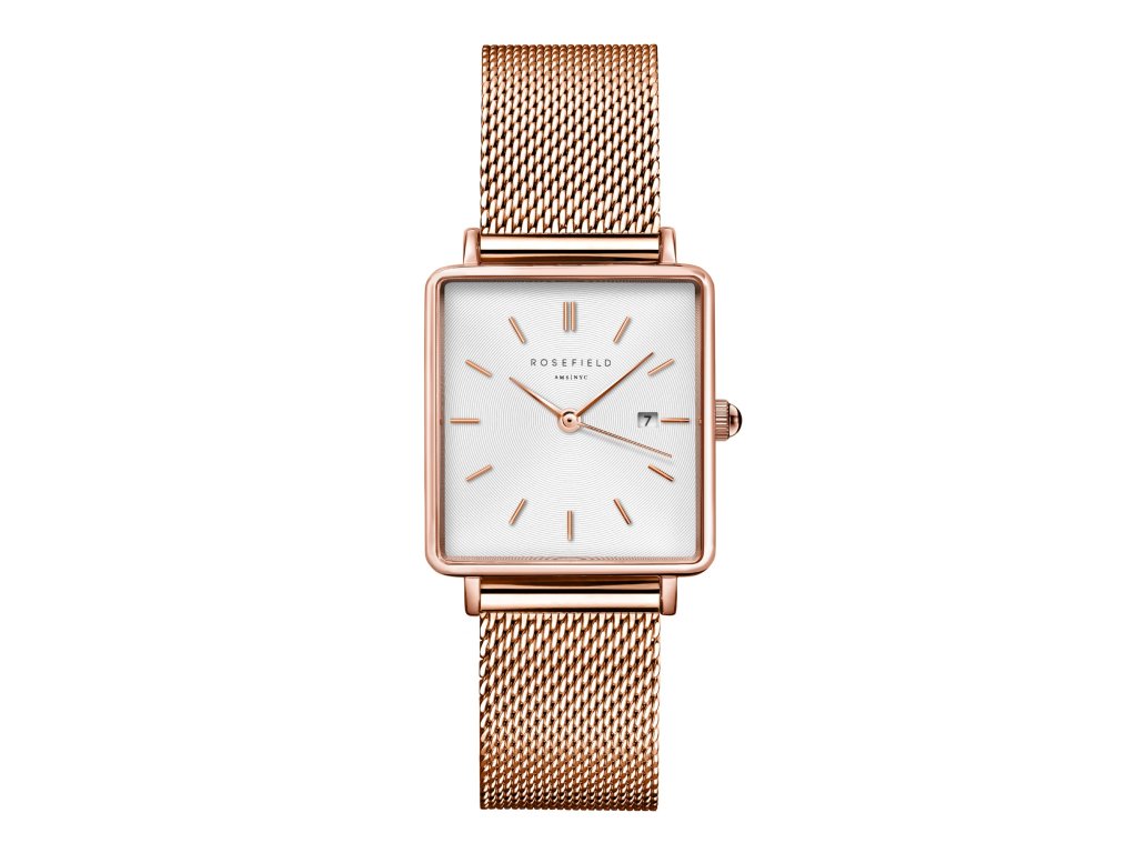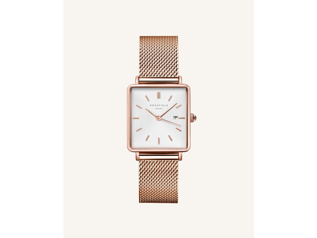 Štvorcové náramkové hodinky vo farbe ružového zlata s milánskym strojčekom