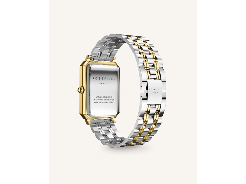 Obdĺžnikové hodinky so svetlým ciferníkom, doplnené prepleteným oceľovým ťahom, všetko v kombinácii striebornej a zlatej farby