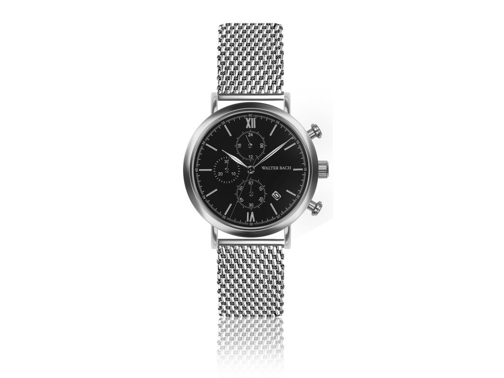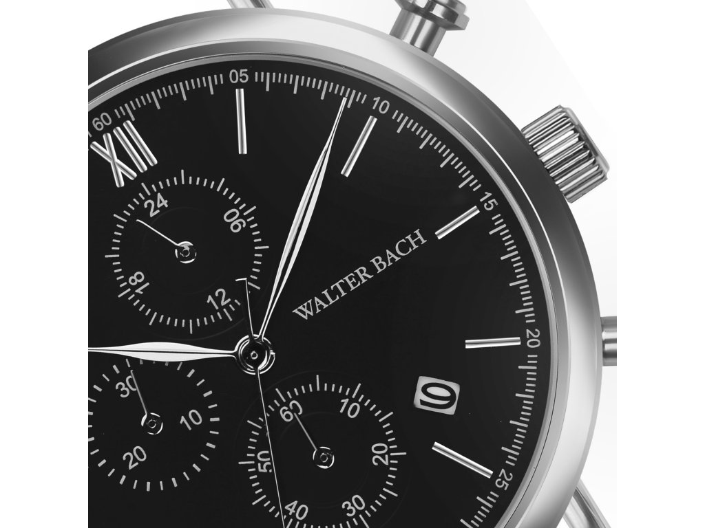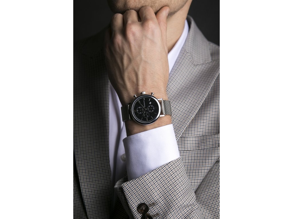 Pánske hodinky v striebornej farbe s čiernym ciferníkom a rímskymi číslicami.