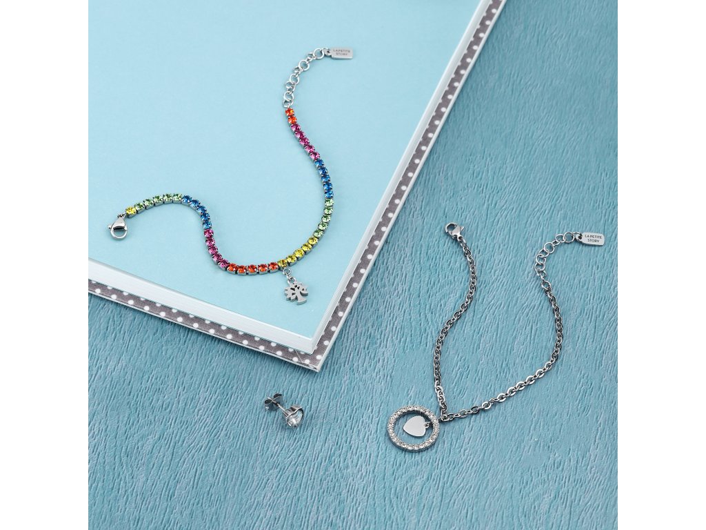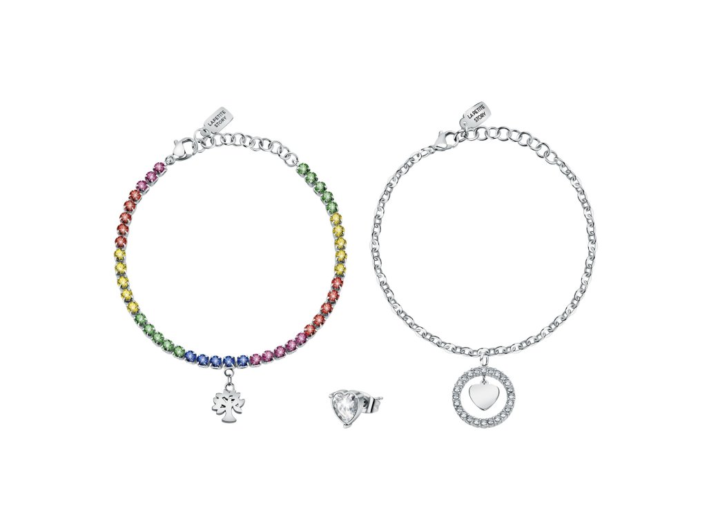 Jeden náramok posiaty farebnými kryštálmi jezdobená príveskom stromu života, druhá je zdobená príveskom so symbolom srdca. Náušnice v tvare srdca s kryštálom z kubických zirkónov svojím šarmom dopĺňajú celú súpravu.