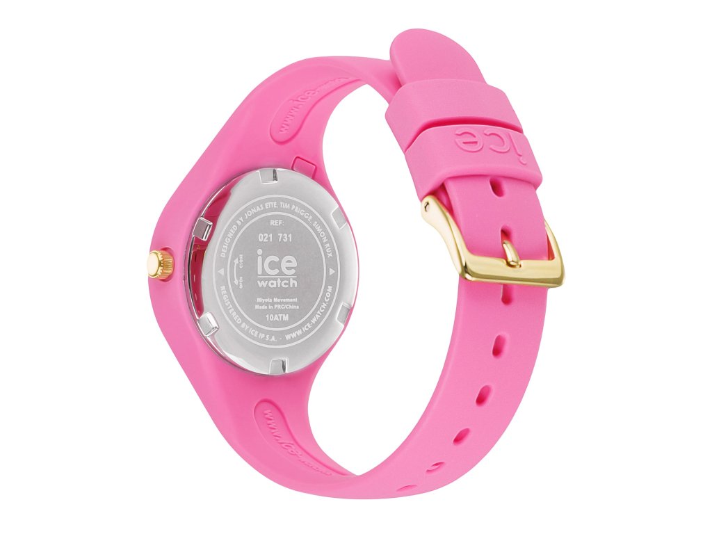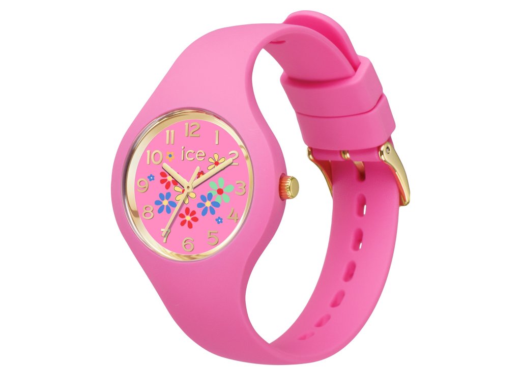Model ICE Flower Pinky Bloom sa môže pochváliťsýto ružovej farby, ktorú dopĺňajú drobné kvety a ručičky, číslice a ďalšie detaily v zlatej farbe na malom ciferníku.