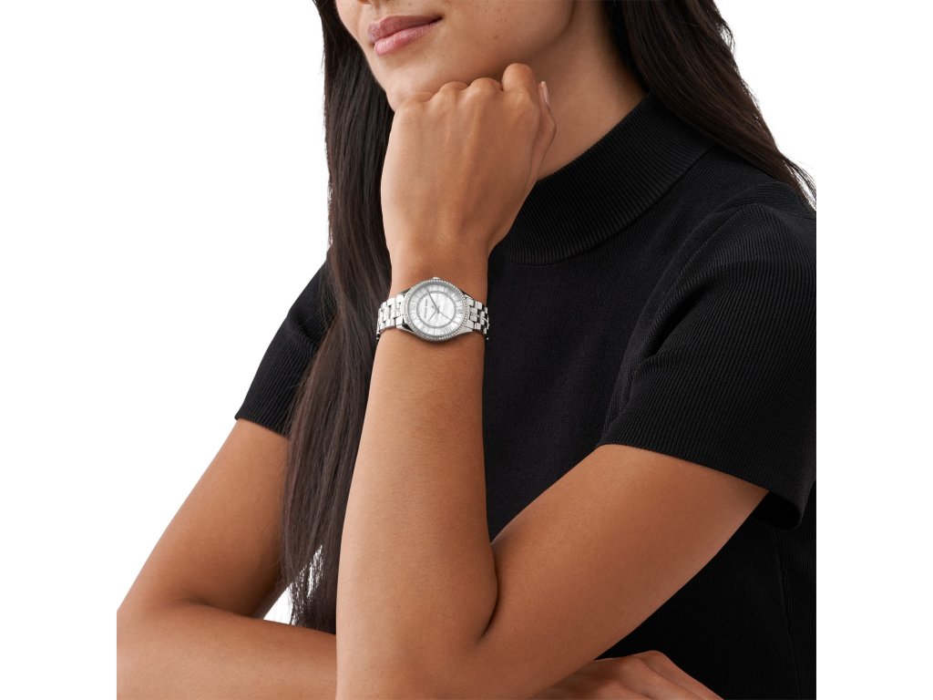 Okrúhle puzdro zdobené kryštálmi poskytuje hodinkámneodolateľný lesk. Remienok z nehrdzavejúcej ocele tiež zdobený kryštálmi vyzerá elegantne a moderne zároveň. Dominantou je perleťový ciferník s priemerom 33 mm, ktorý je tiež zdobený kryštálmi. Každý okamih s týmito hodinkami je tak trblietavo výnimočný.
