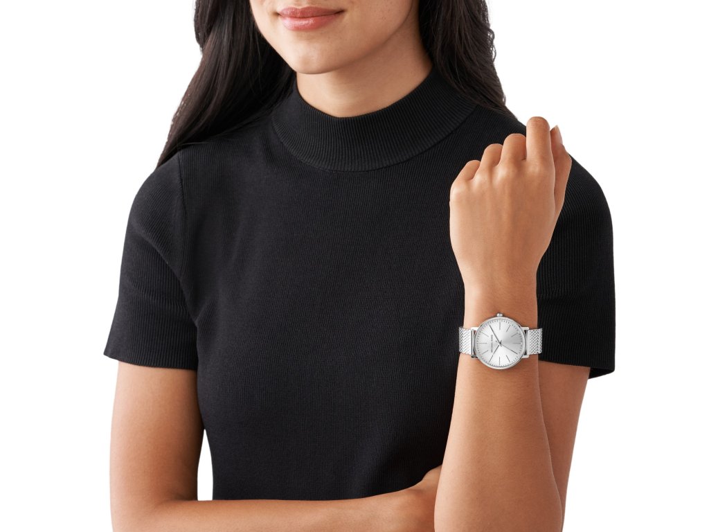 Strieborný ciferník s priemerom 38 mm je zdobený trblietavými kryštálmi, ktoré vytvárajúvizuálna symfónia. Je zasadený do okrúhleho puzdra rovnakej farby. Remienok v štýle sieťoviny vo farbe nehrdzavejúcej ocele v kombinácii s ciferníkom a puzdrom vytvára kombináciu, ktorá žiari eleganciou a nadčasovým štýlom. Tieto hodinky sú tak vkusným doplnkom pre každú ženu, ktorá má záľubu v móde.