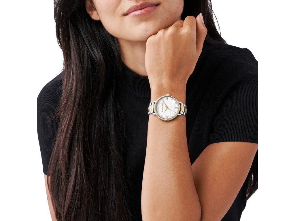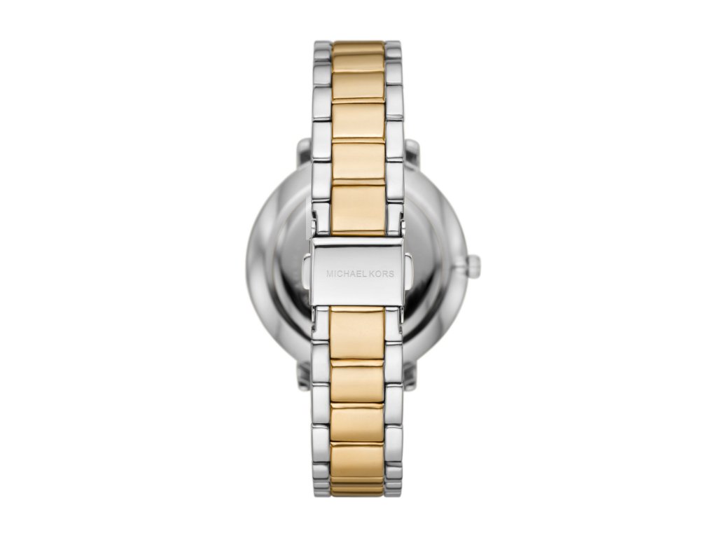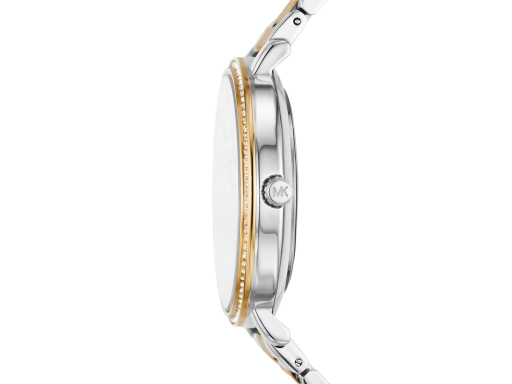 38 mm biely ciferník s kryštálmi na mieste indexov a logami MK nielenže zabezpečuje čitateľnosť času, ale zároveň dodáva hodinkámsofistikovaný a ženský vzhľad. Puzdro zlatej farby je po obvode zdobené ďalšími kryštálmi a ladí so strieborno-zlatým oceľovým remienkom.