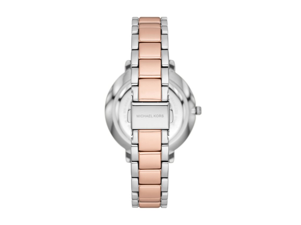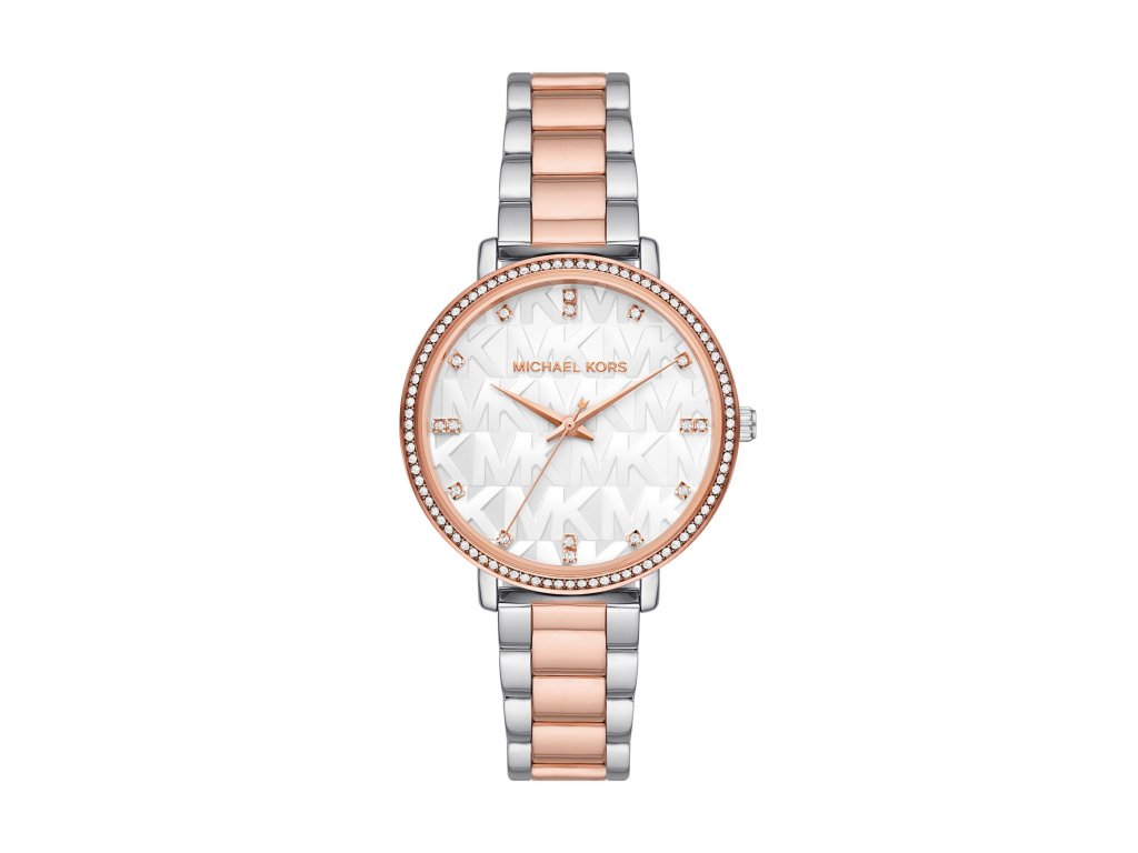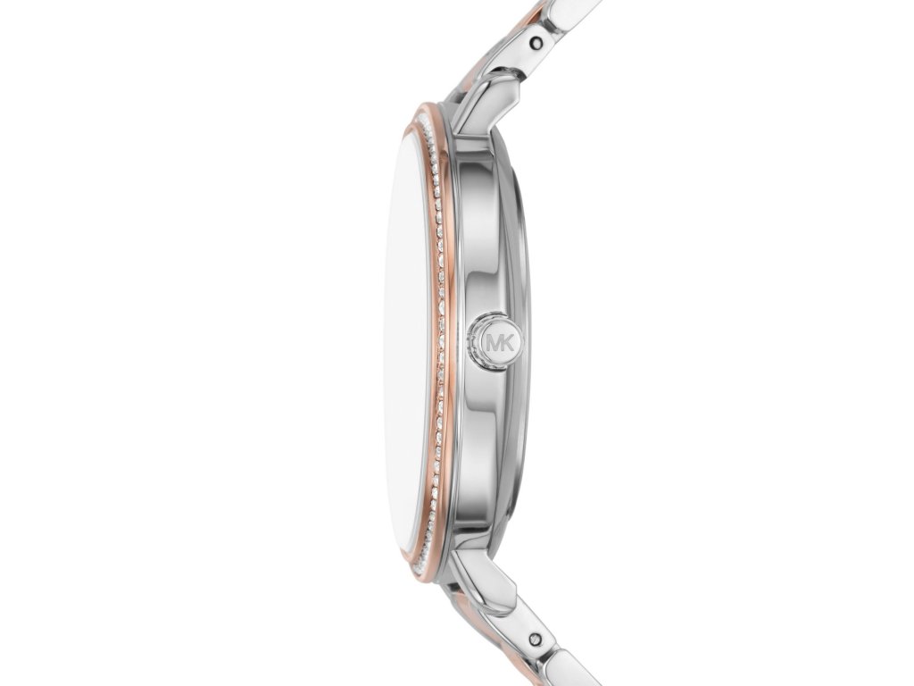 Okrúhle puzdro z ružového zlata zdobené kryštálmi ukrýva ciferník s priemerom 38 mm s logami MK. Remienok z nehrdzavejúcej ocele kombinuje strieborné a ružové zlato, čím dodáva dizajnu sofistikovaný prvok a zaručuje pohodlné nosenie.