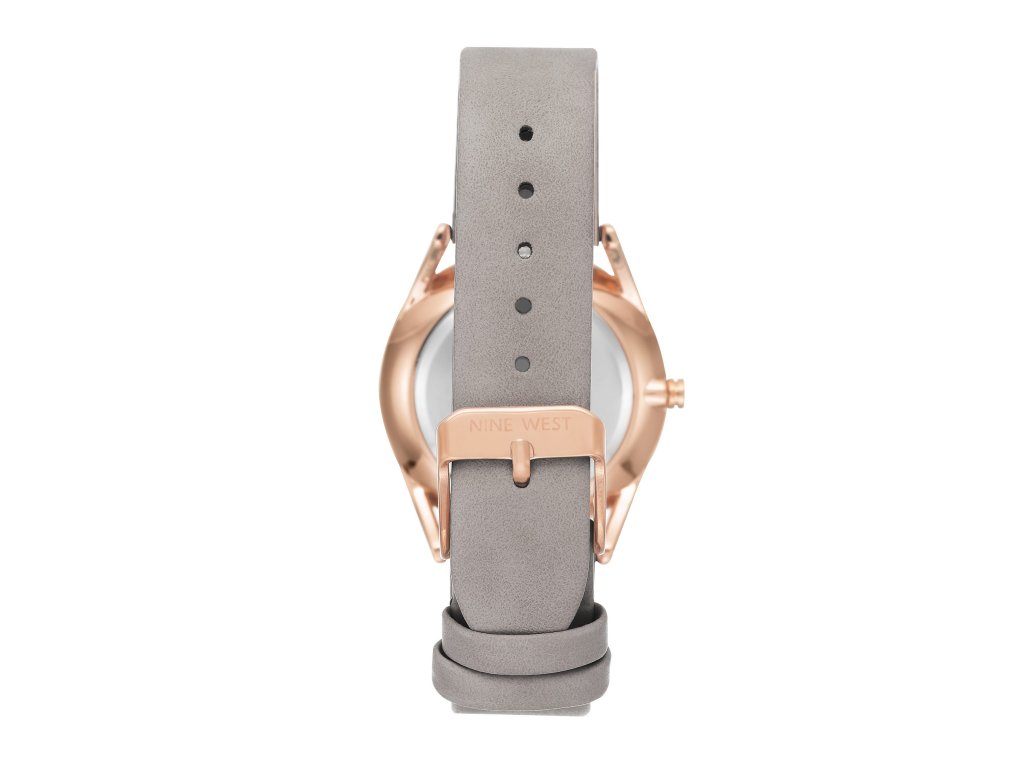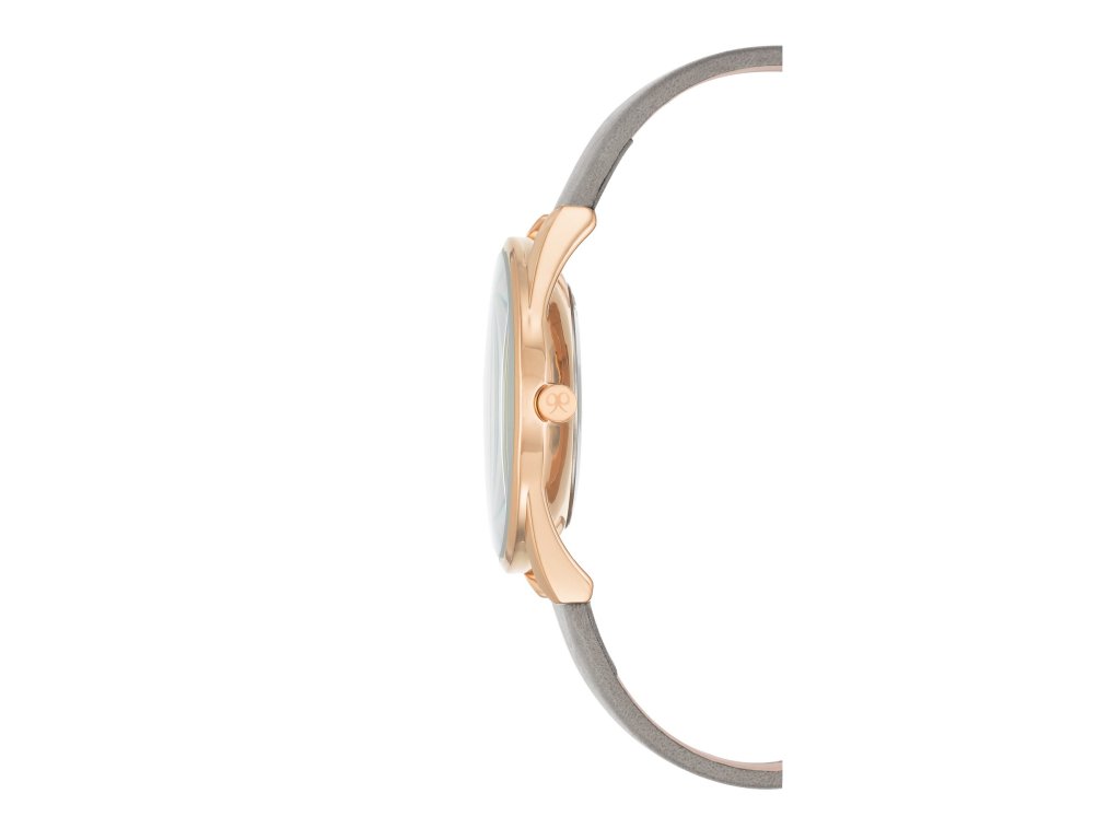 Dámske hodinky s bielym ciferníkom s detailmi z ružového zlata. Ciferník s čiarkovanými indexmi dodáva hodinkám elegantný vzhľad. Remienok je vyrobený z jemnej svetlosivej umelej kože.