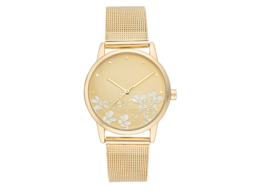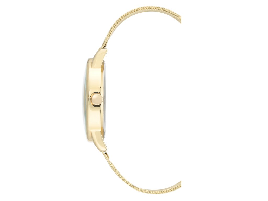 Zlaté dámske hodinky, ktoré zaujmú ciferníkom s jemným kvetinovým vzorom. Zlatý ciferník má namiesto klasických riadkových indexov a číslic drobné zlaté bodky. Zlatý perforovaný remienok robí z hodiniek veľmi elegantný a luxusný kúsok.
