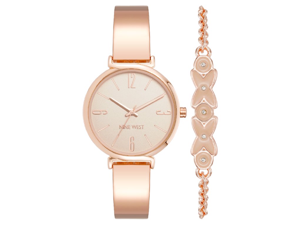 Dámska darčeková súprava hodiniek a náramku v ružovom zlate. Jednofarebné hodinky s ciferníkom, ktorý kombinuje čiarkové a číselné indexy. Náramok je doplnený trblietavými striebornými kamienkami. Ideálny darček pre vašich blízkych!