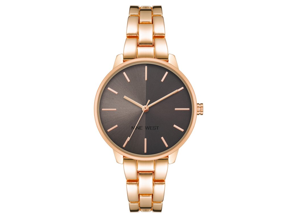 Elegantné dámske hodinky z ružového zlata s okrúhlym ciferníkom tmavosivej farby, ktorý dopĺňajú indexy z ružového zlata.