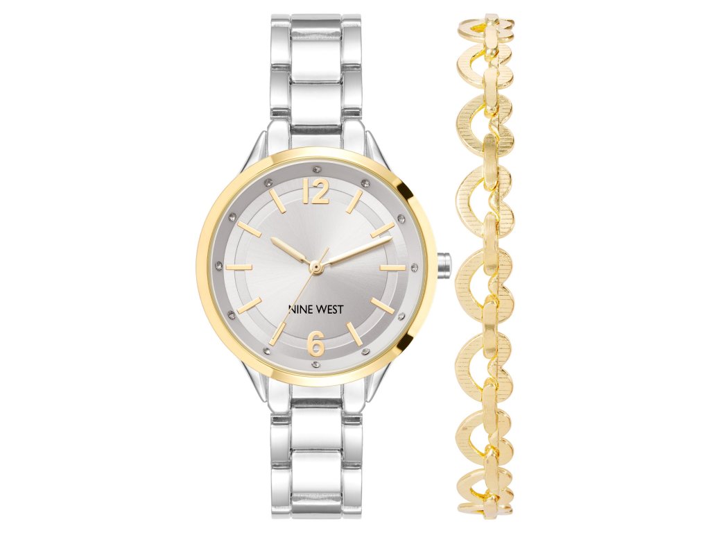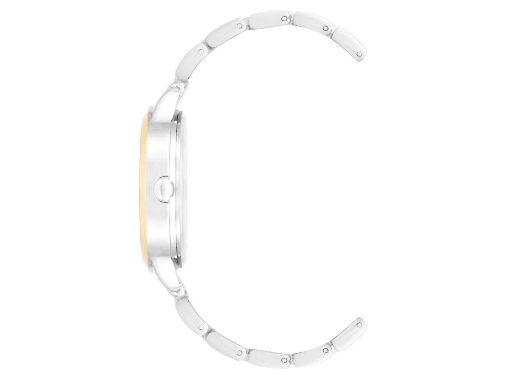 Dámska darčeková súprava hodiniek a náramku. Strieborné hodinky s ciferníkom, ktorý je doplnený malými trblietavými kamienkami a zlatými detailmi. Strieborný ciferník s číselnými a riadkovými indexmi v zlatej farbe. Zlatý náramok so srdiečkami tvorí s hodinkami ideálnu kombináciu. Ten správny darček pre vašich blízkych!