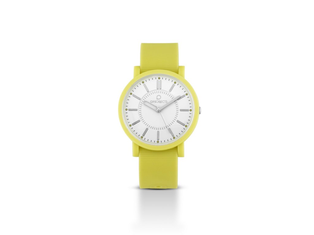 Žlté okrúhle unisex hodinky s bielym ciferníkom, sivo-žltými značkami, sekundovou ručičkou a sivým logom.