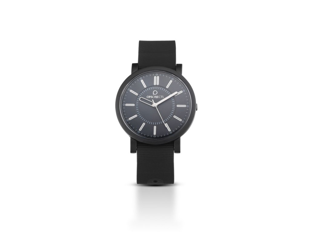 Čierne okrúhle unisex hodinky s čiernym ciferníkom, bielymi značkami, sekundovou ručičkou a bielym logom.