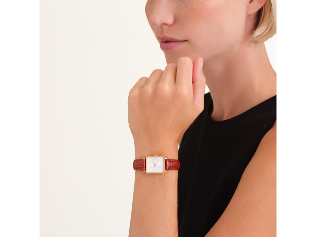 Krabice Rosefield XS majú drobné štvorcové puzdro s priemerom 22 mm, ktoré dobre sedí na zápästí.Kombinácia teplých zlatých tónov a hnedej kože dodáva hodinkám jemný, ženský charakter. Čistý biely ciferník s dátumovkou dopĺňa decentný dizajn, ktorý nepodlieha trendom.