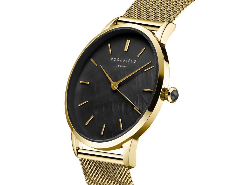 Dámske hodinky Rosefield Pearl Edit Mesh Black Gold zaujme atraktívnou kombináciou moderného minimalizmu a kontrastných prvkov.Ťahanie pozláteného oceľového pletiva vyzerá ľahko a elegantne, zatiaľ čočierny perleťový ciferník dodáva týmto štýlovým hodinkám osobitý vzhľad.