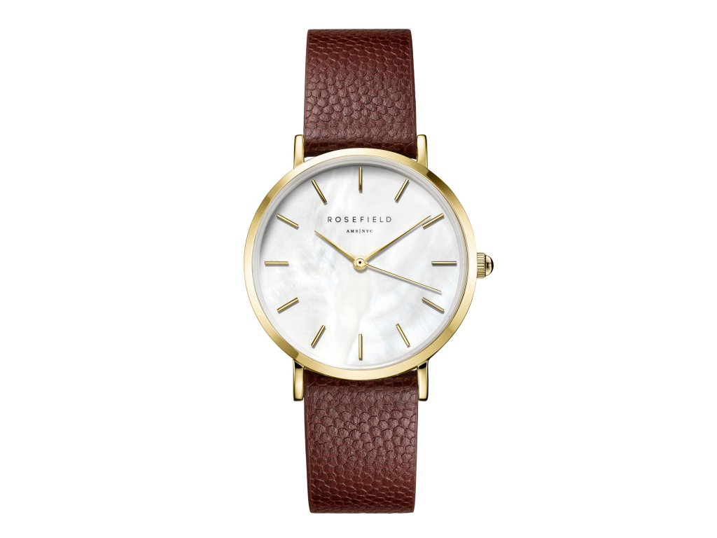 Hnedý kožený remienok dopĺňa klasické zlaté hodinky s perleťovým ciferníkom