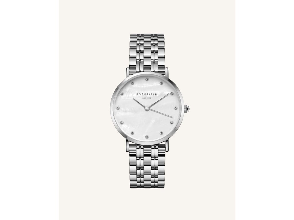 Klasické náramkové hodinky z nehrdzavejúcej ocele v zlatej farbe s perleťovým ciferníkom osadeným kryštálmi