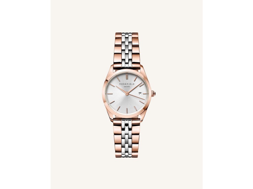 Klasické dámske hodinky menšej veľkosti v kombinácii striebra a ružového zlata so strieborným ciferníkom
