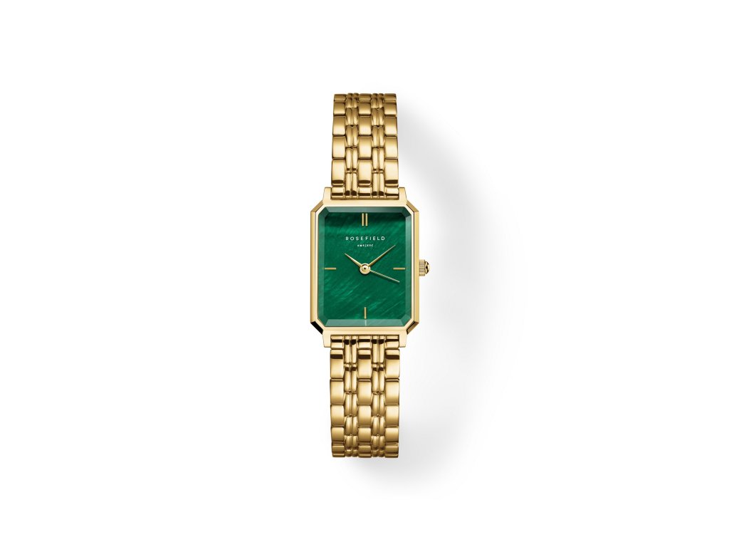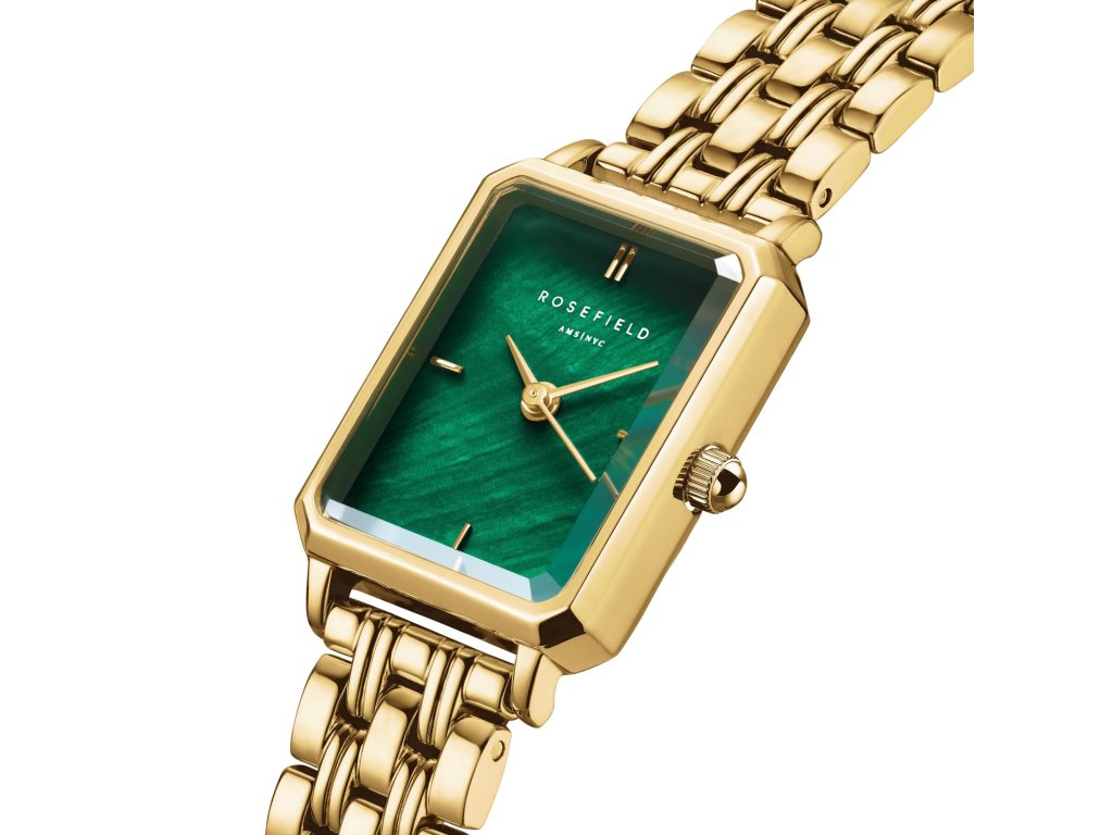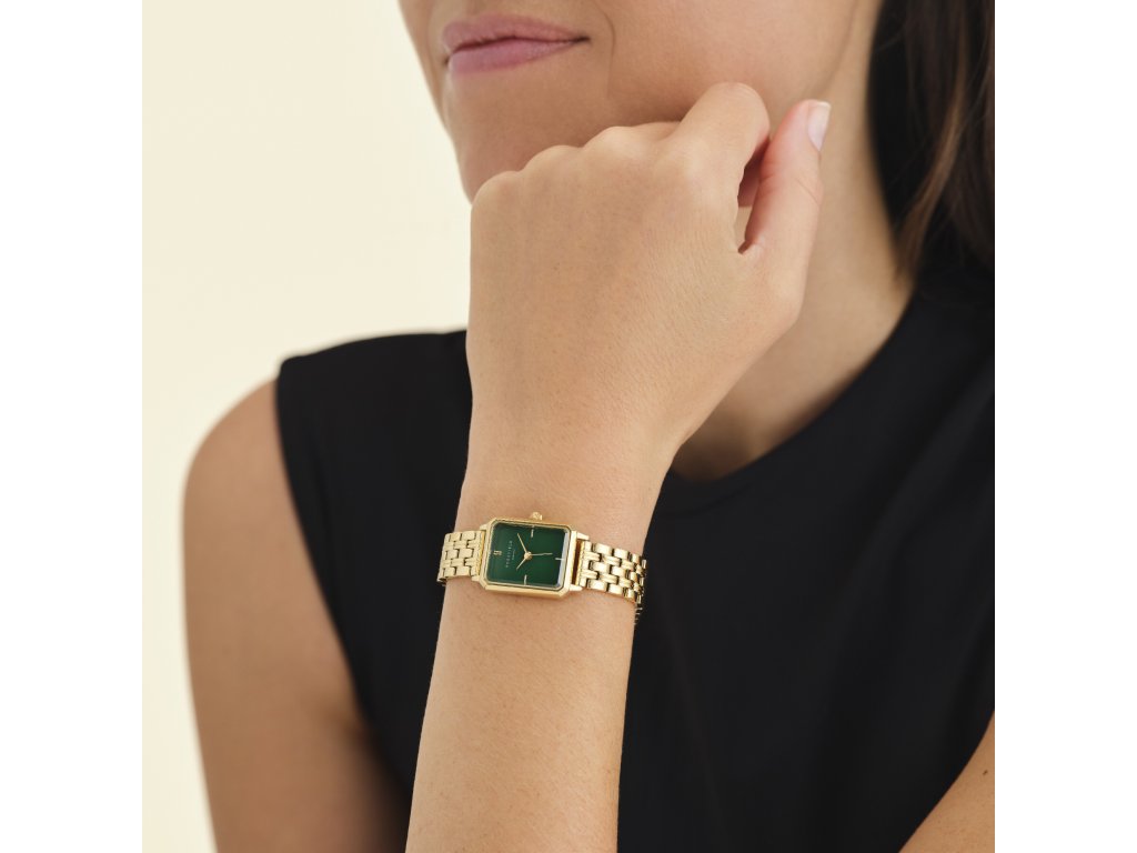 Hodinky zaujmúvýrazný smaragdový ciferník s perleťovým povrchomna ciferníku sú 3 jemné zlaté ručičky s minimalistickými indexmi.