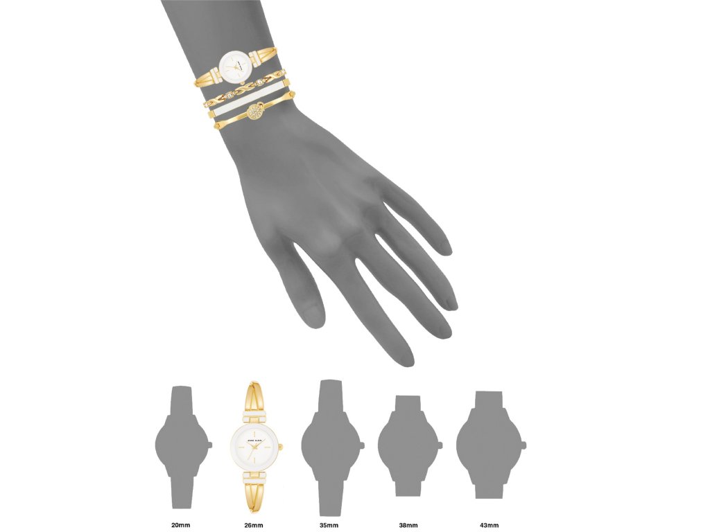 Dámske náramkové hodinky. Puzdro a náramok sú vyrobené z bezniklového obyčajného kovu v zlatej farbe. Biely ciferník lemuje biela luneta a časť náramku a jeden z náramkov je zdobený bielym smaltom. Hodinky sa predávajú s 3 ďalšími náramkami. Vodotesnosť 30 M.