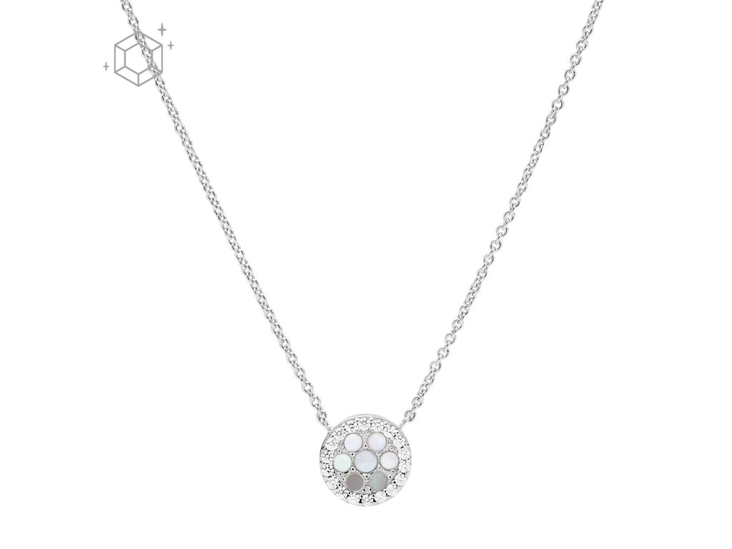Šperk upúta pozornosť trblietavými zirkónmi a perleťovými akcentmi zasadenými do kruhu.Pôsobí veľmi žensky a vďaka svojmu dizajnu je vhodný na každodenné nosenie. Šperk je vyrobený zo 100 % striebra 925/1000 a jeho hmotnosť je 9 g.