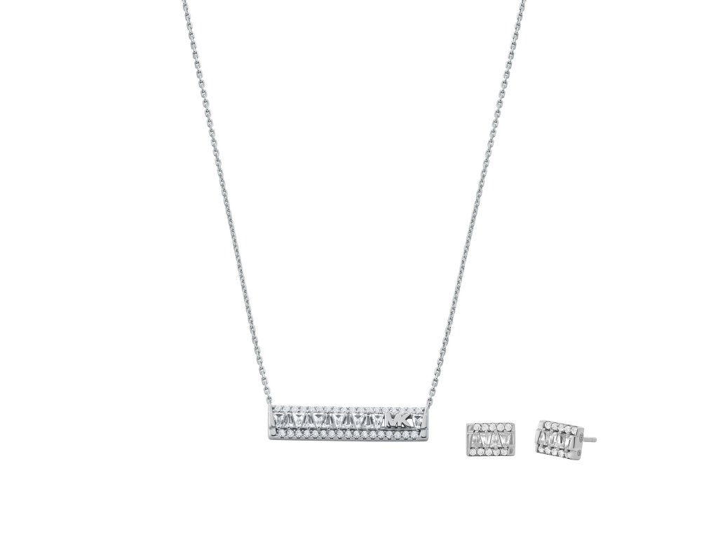 Súprava obsahuje náhrdelník a náušnice, ktoré dodajú každému outfitu šmrnc a jemnú iskru dizajnérskeho luxusu. Dajú sa nosiť aj samostatne, ale spolu s nimi bude každý slávnostný outfit vyzerať skvele. Sú vyrobené zo striebra, zdobené zirkónmi a malým logom MK. Hmotnosť šperku je 3,65 g.