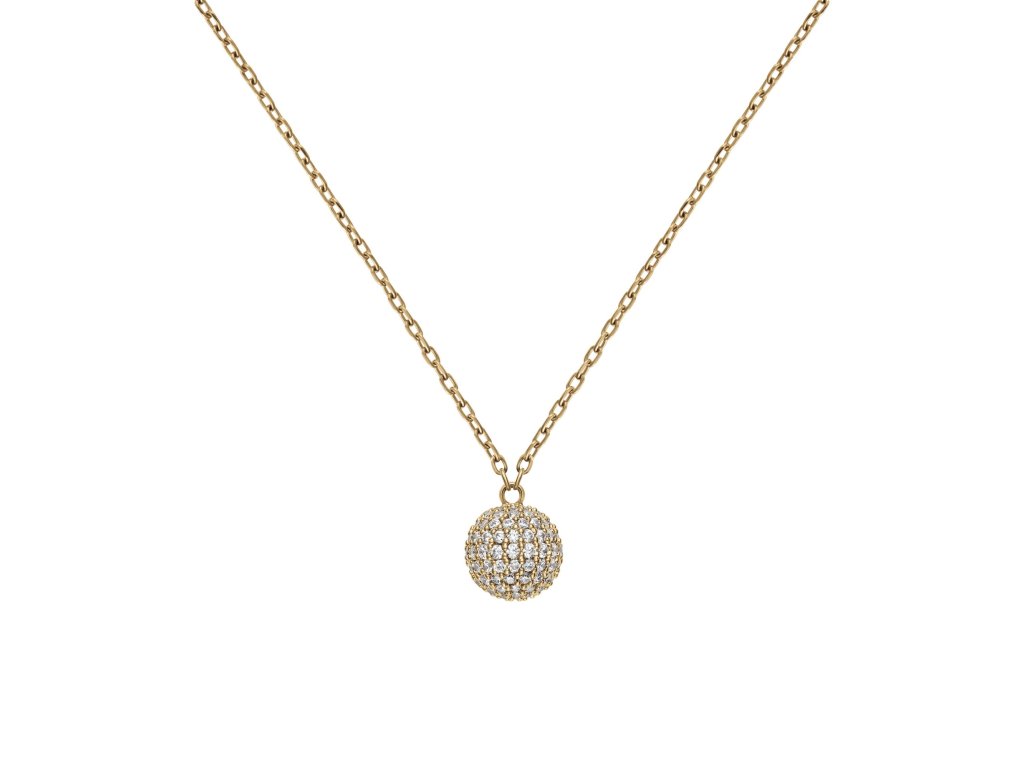 Decentný náhrdelník Pavé Crystal si vás získa svojoujemná elegancia a hravosť. Malá retiazka, na ktorej je zavesenáguľový prívesok s kryštálmi kubické zirkóny budú verným doplnkom vášho pracovného kostýmu aj voľnočasového oblečenia. Prívesok sa na svetle nádherne trbliece a jeho odlesky upútajú nejedno oko.