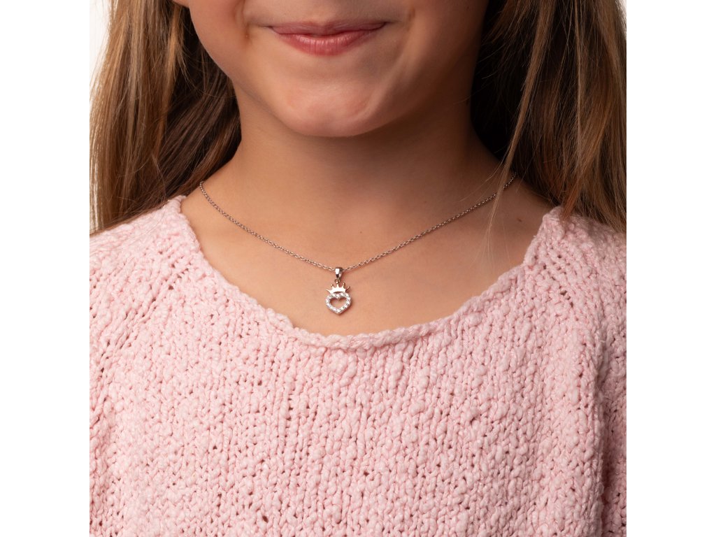 Šperky sú vyrobené zo striebra 925/1000.Doplnené príveskom srdca s korunkou, korunka je z ružového zlata a celý prívesok jeposiate jemnými kryštálmiktoré náhrdelníku dodávajú princeznovský vzhľad.