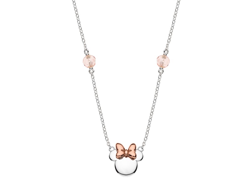 Šperky sú vyrobené zo striebra 925/1000.S príveskom v tvare siluety hlavy myšky Minniektorého mašľa je vyrobená v ružovo-zlatom tóne, ktorý šperku dodáva jemný nádych.K dispozícii sú aj jemné ružové korálky.
