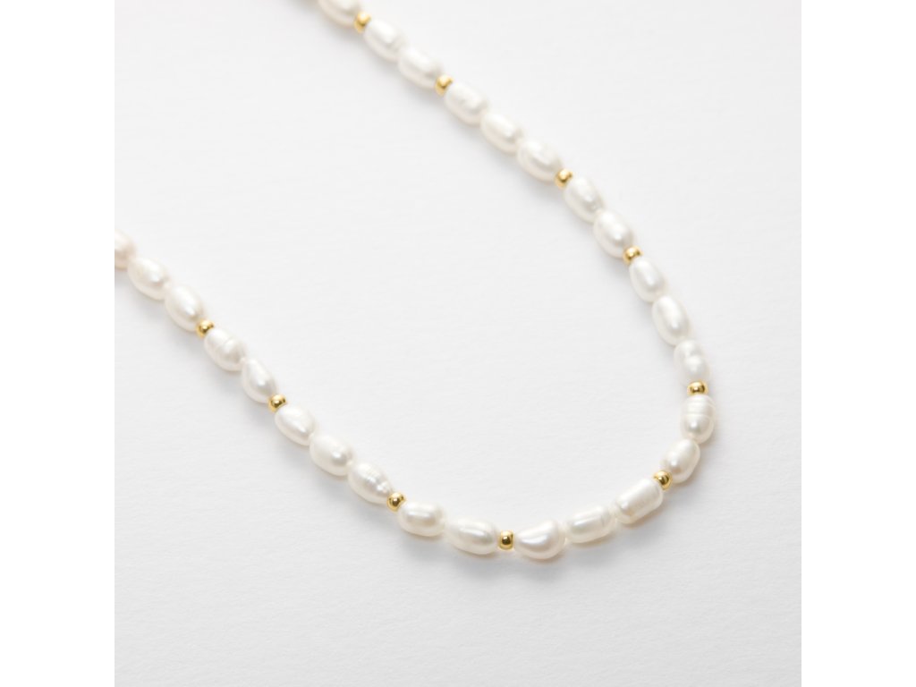 Medzi sladkovodnými perlami sa nachádzajú malé zlaté guľôčky. Dĺžku retiazky si môžete nastaviť.