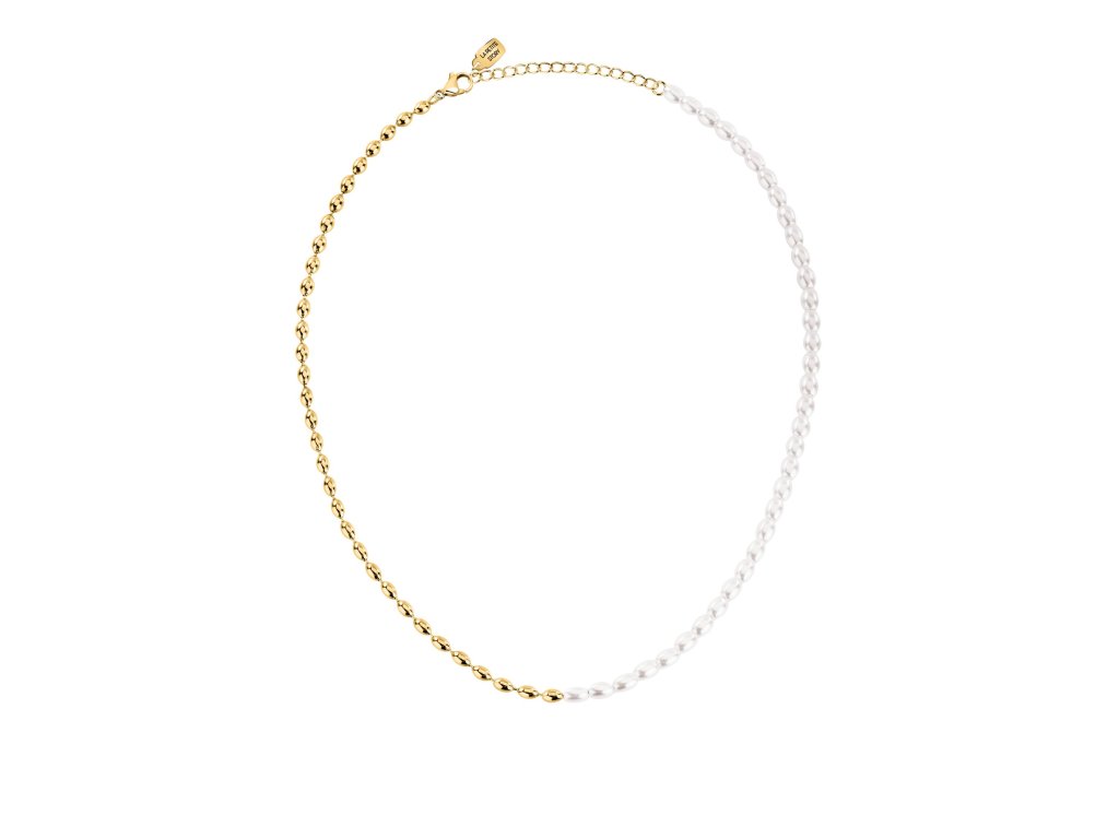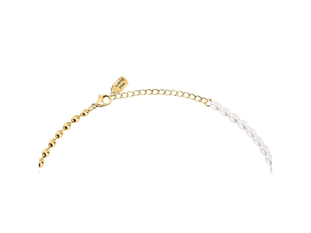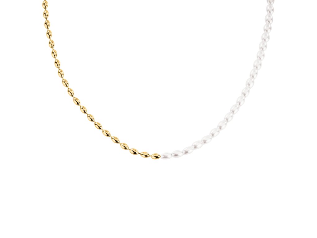 Náhrdelník je vyrobený z nehrdzavejúcej ocele zlatej farby a má nastaviteľnú dĺžku 40-45 cm. Zlatý lesk dodáva šperku eleganciu, zatiaľ čo biele syntetické perly pôsobia jemne a romanticky.Spoločne vytvárajú harmóniu, ktorá vynikne pri ležérnom oblečení aj večerných šatách.