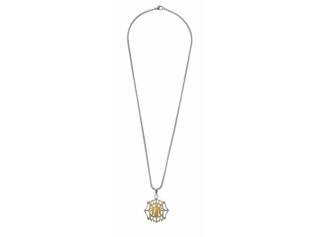 Robustný prívesok v tvare pavučiny so zlatým pavúkom je nielen štýlový, ale aj výrazný symbol odvahy a hrdinstva, ktorý okamžite upúta pozornosť. Prívesok je potiahnutý PVD vrstvou, ktorá zabezpečujelesk a trvanlivosť. Prívesok je zavesený na guľôčkereťaz vyrobená z vysoko kvalitnej nehrdzavejúcej ocele. Dĺžka retiazky je 56 cm.