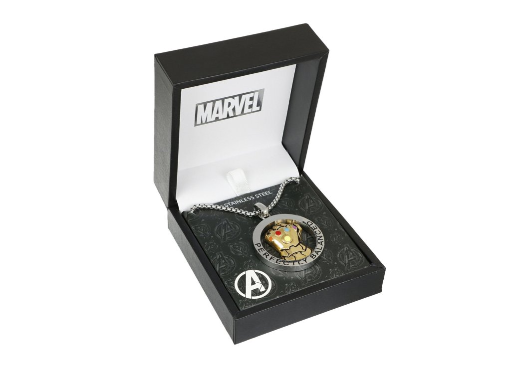 Najvýraznejším prvkom náhrdelníka jeprívesok v tvare ikonickej Thanosovej rukavice vloženéso šiestimi žiarivými farebnými kryštálmipredstavuje mocné kamene nekonečna - každý s vlastným jedinečným významom. Prívesok je zavesený na 56 cm dlhej guľôčkovej retiazke z nehrdzavejúcej ocele.