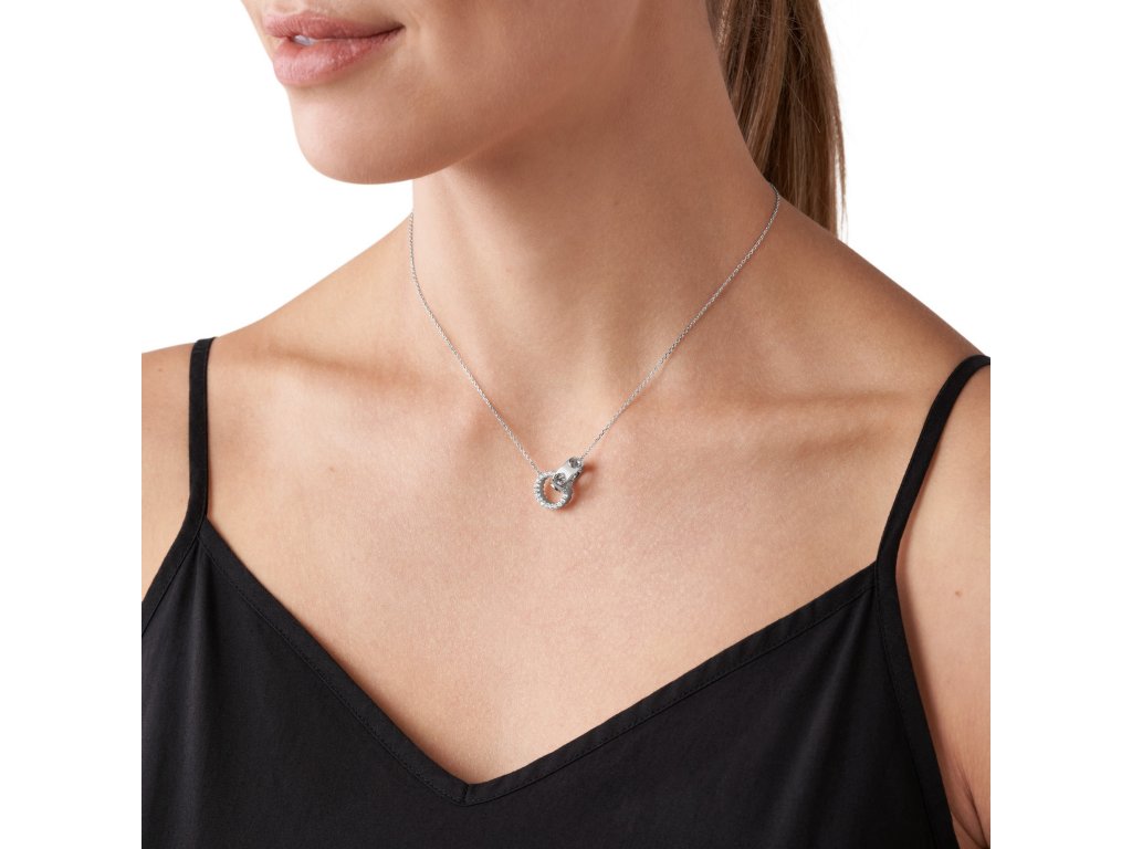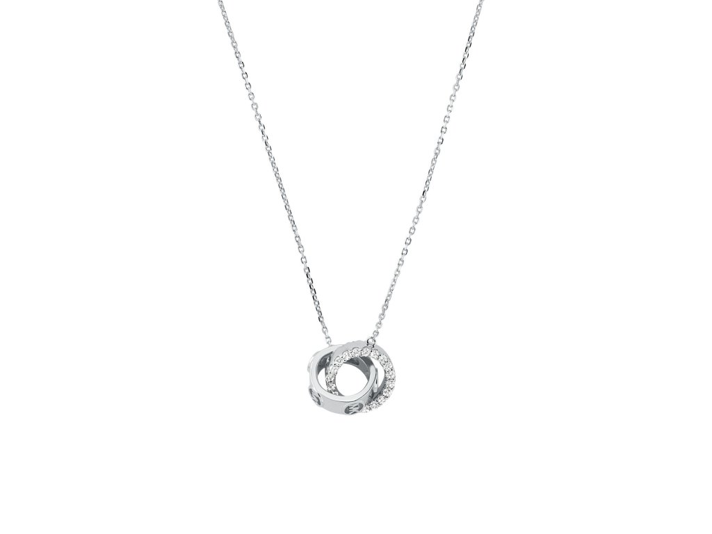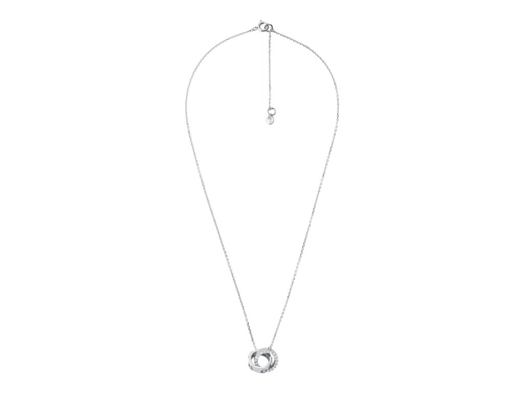 Náhrdelník je vyrobený zo striebra 925/1000 a zdobia ho dva prepletené kruhy.Na jednej je symbol MK a druhá žiari trblietavými zirkónmi. Jeho lesk spolu s farbou šperku, skromným dizajnom a kvalitným materiálom z neho robí veľmi ženský a nadčasový doplnok. Hmotnosť šperku je 10 g.
