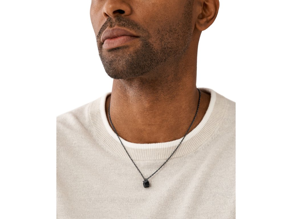 Pánsky náhrdelník z nehrdzavejúcej ocele v striebornej farbe je osadený dvoma príveskami.Jeden je zdobený tmavými kryštálmi a druhý má tvar loga značky.
