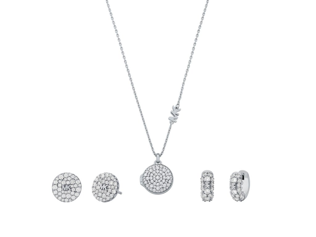 Dámska strieborná súprava šperkov Michael Kors je ideálnou voľbou pre ženy, ktoré hľadajú nadčasovú eleganciu a jednotný štýl.Súprava obsahuje jemný náhrdelník s okrúhlym príveskom a dva páry náušníc - okrúhlymi cípmi so zapínaním na gombíky a polkruhovými náušnicami. Všetky šperky sú zdobenés čírymi zirkónmi a výrazným logom Michael Kors uprostred, ktorý dodáva luxusný, ale nenápadný vzhľad.