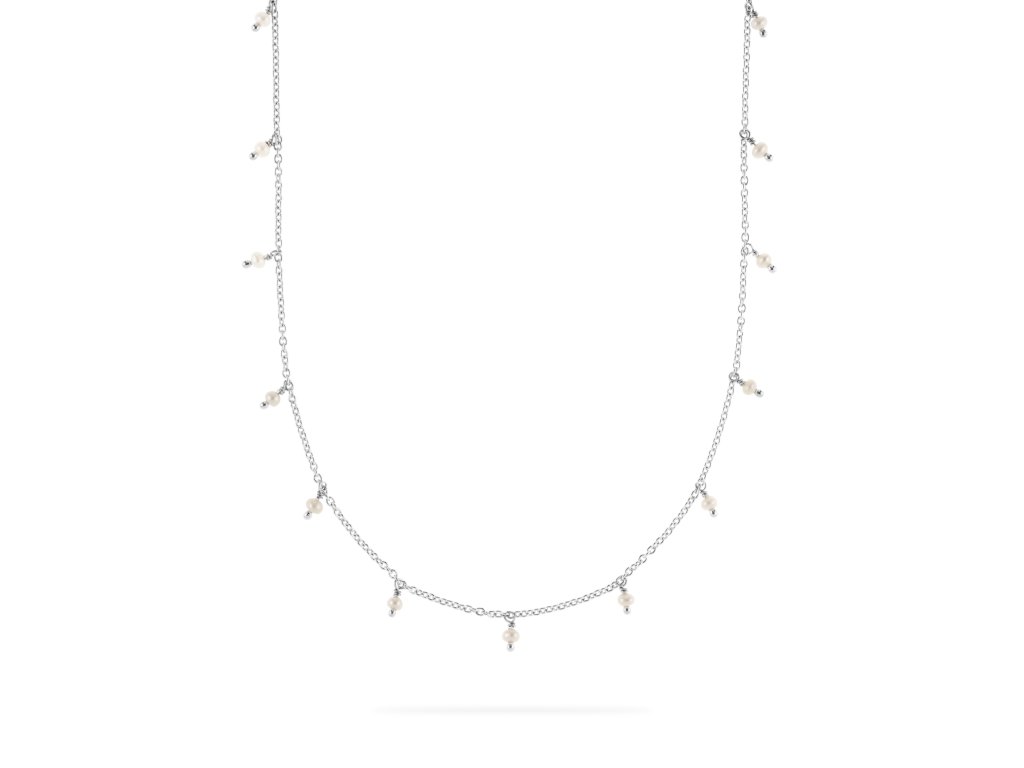 Sedemnásť bielych sladkovodných perál jeväčšinový prvok celého náhrdelníka. Vďaka tomu je tento 42 cm dlhý šperk nádherným doplnkom. Je zakončený pôsobivými korálkami striebornej farby. Postriebrené prívesky, na ktorých sú zavesené perly, sú k náhrdelníku pripevnené drobnými článkami zo striebra rýdzeho lesku potiahnutého ródiom, ktoré ho chráni pred poškodením. Nemožno prehliadnuť malý hranol vkusne umiestnený pri zapínaní, ktorý nesie názov značky.