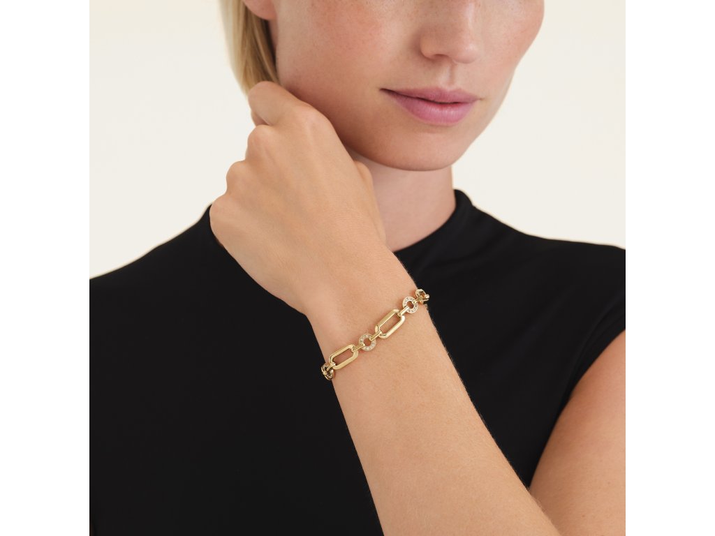 Vo výraznomdizajn v tvare reťaze strieda podlhovasté a okrúhle očká, z ktorých tri sú vybavenés trblietavými kryštálmiktoré dodajú každému gestu žiarivý lesk a luxusný nádych.