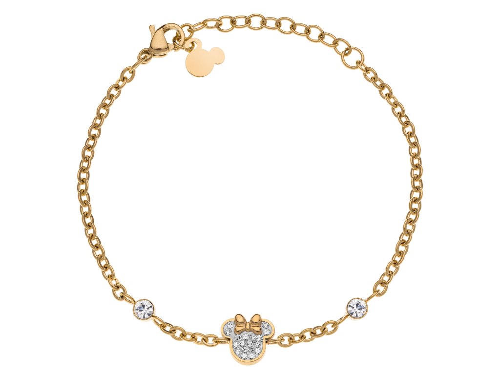 Tento náramok s ozdobou hlavy myšky Minnie od spoločnosti Disney je vyrobený z pozlátenej nehrdzavejúcej ocele s lesklým povrchom. Hlava myšky Minnie jezdobené čírymi kryštálmiktoré spolu so zlatou farbou ocele pôsobia skutočne kráľovsky. Zaujímavým detailom sú aj dva kryštály čírej farby, ktoré náramok zdobia a dodávajú mu na jedinečnosti. Maximálna dĺžka náramku je 17 cm. Dodáva sa v štýlovej krabičke.