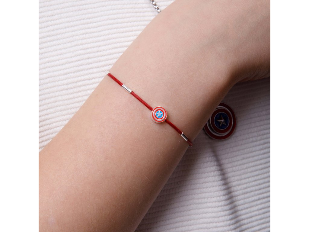 Náramok je vyrobený z kvalitnej červenej látky a zdobený jemnými striebornými ozdobami, ktoré mu dodávajú elegantný vzhľad a dotvárajú celkový dizajn. Striebro má rýdzosť 925/1000, čo zaručuje vysokú kvalitu. Hlavným prvkom náramku je symbol superhrdinu Kapitána Ameriky, ktorý je vyrobený z červeného a modrého smaltu.