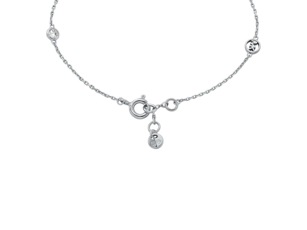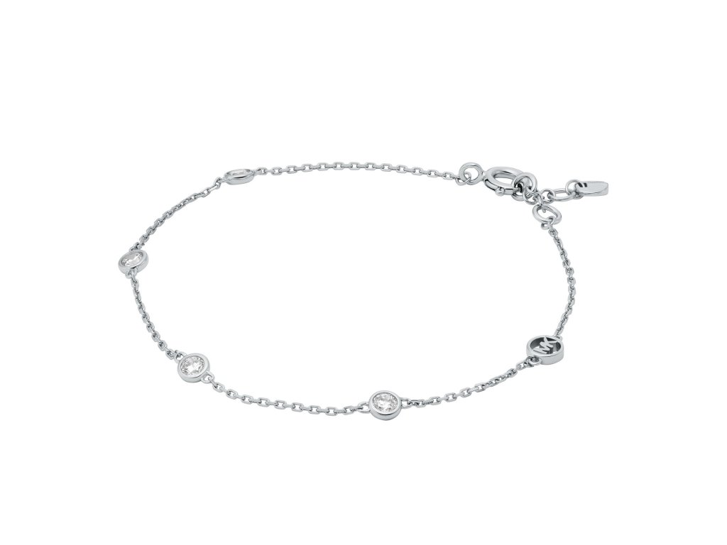 Dámsky náramok je vyrobený zo striebra 925 azdobené niekoľkými trblietavými zirkónmi a jemným logom MK. Jeho dĺžku môžete nastaviť. Hmotnosť šperku je 2 g.