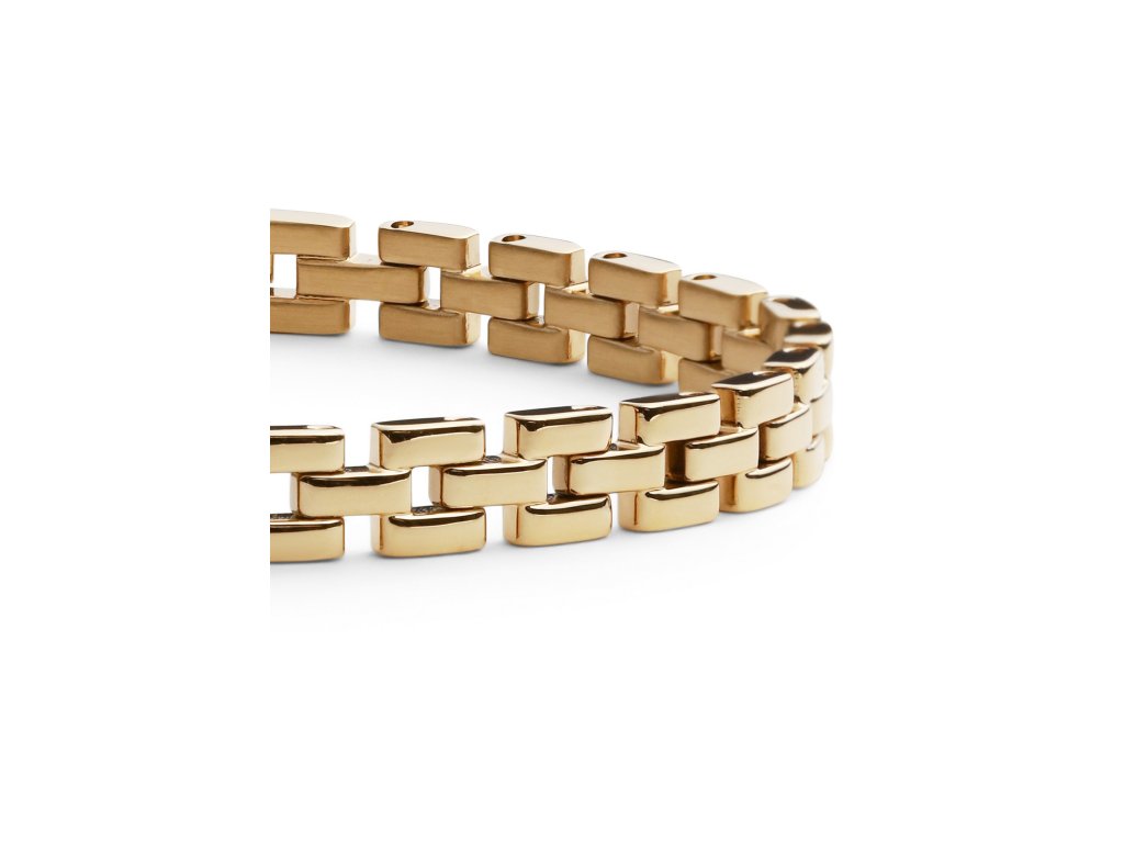Náramok je vyrobený z nehrdzavejúcej ocele a je k dispozícii v niekoľkých veľkostiach a v zlatej, ružovozlatej a striebornej farbe.
