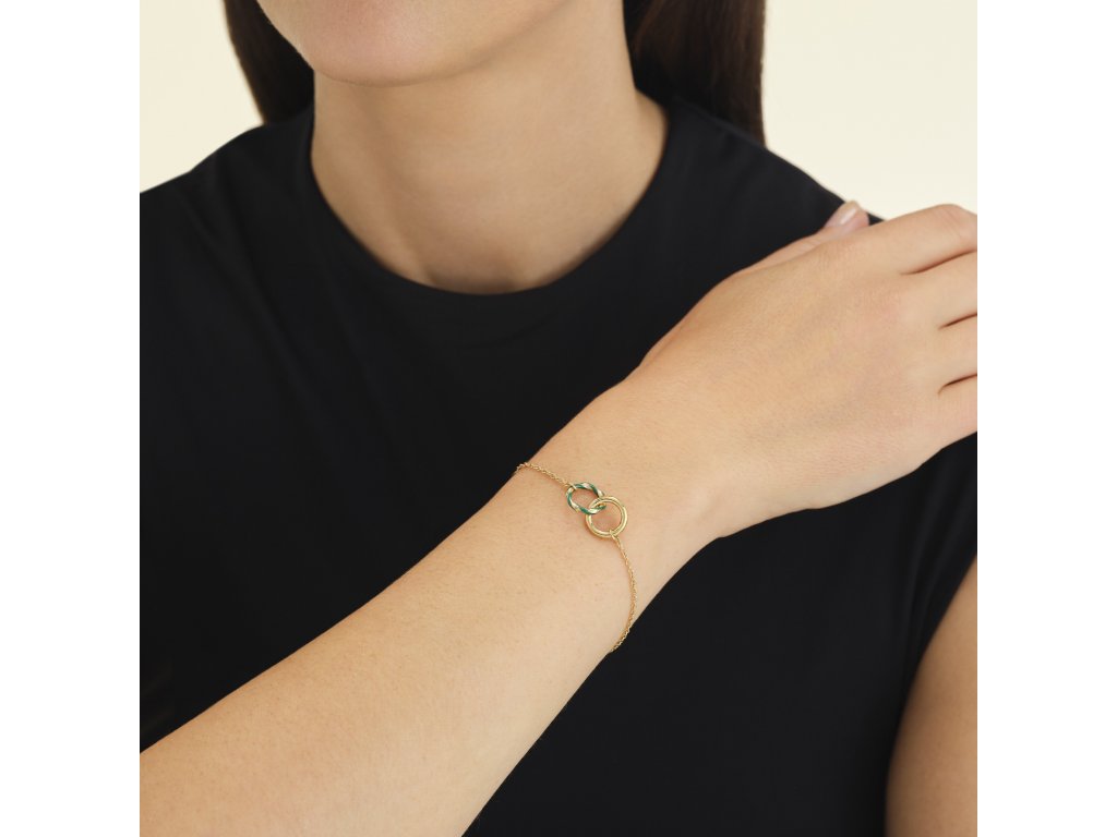 Náramok na rukeveľmi jemný vďaka svojej konštrukcii s dvoma malými slučkami, ktoré sa navzájom prepletajú.Smaragdovo zelené smaltovanie spolu so zlatou farbou pôsobí kontrastne, ale zároveň veľmi harmonicky.